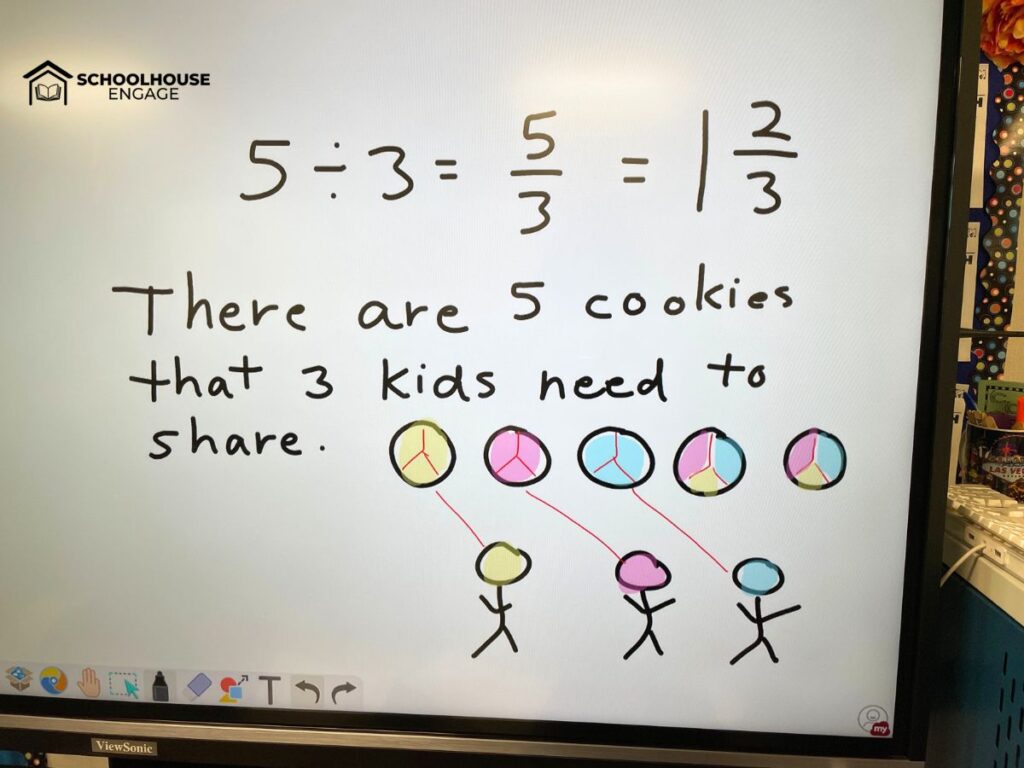 Have your students draw out stick figure people so they can visually “see” how the cookies are being divided. You can also have your students make the cookies out of play-dough and cut the cookies up so they can physically divide the cookie to “give” to each stick figure person.